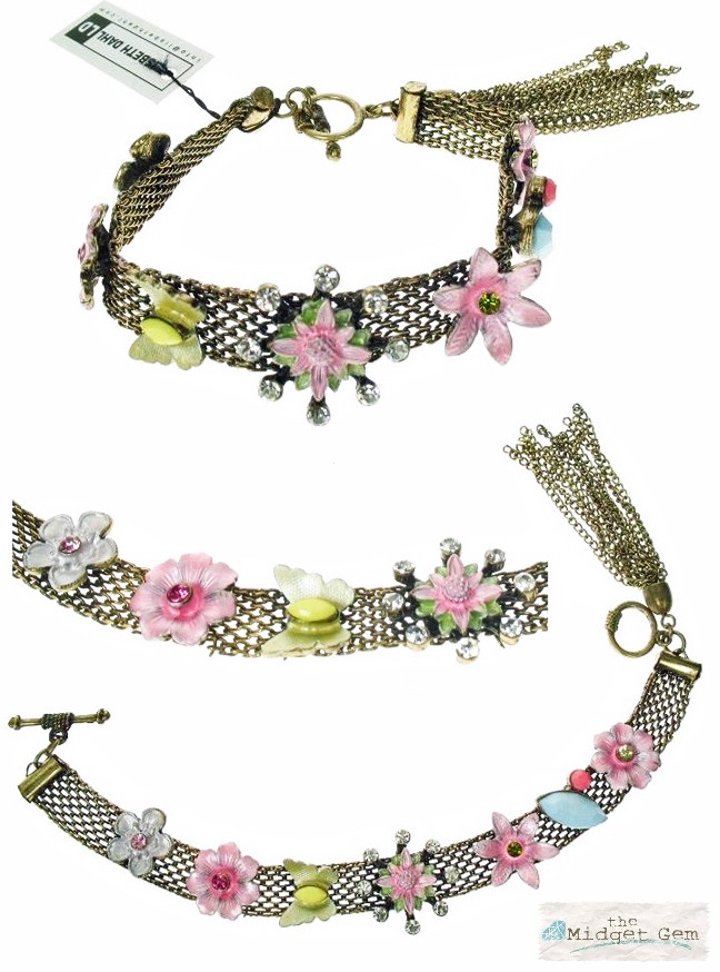 A fluid woven metal bracelet (1cm/10mm wide) decorated with flower and butterfly motifs. Enamels and crystals. Motifs measure 1.2cm/12mm – 2cm/20mm. In subtle pastel shades with vintaged gold plate. 8 inches/20cm long, toggle type fastener with metal tassel.
