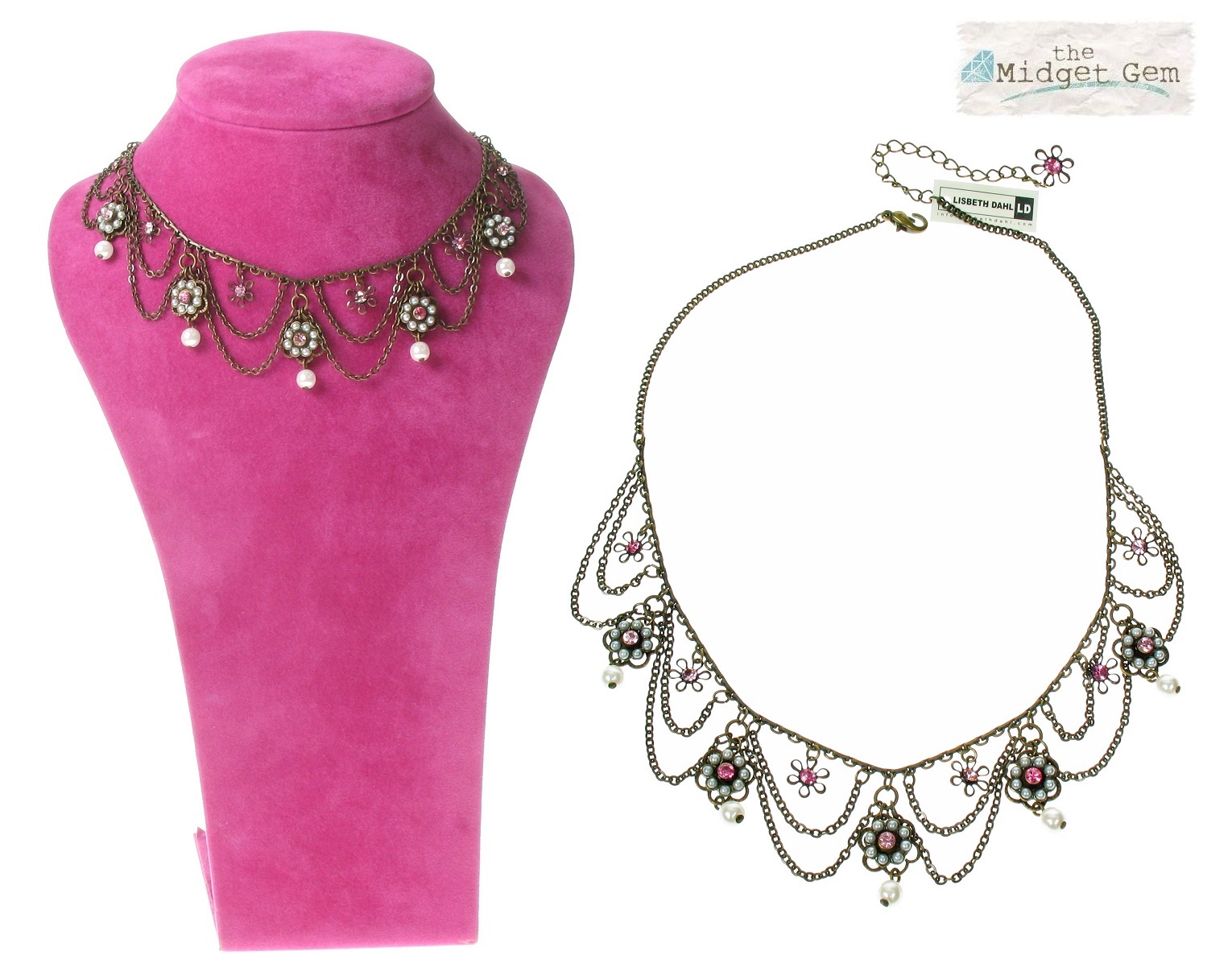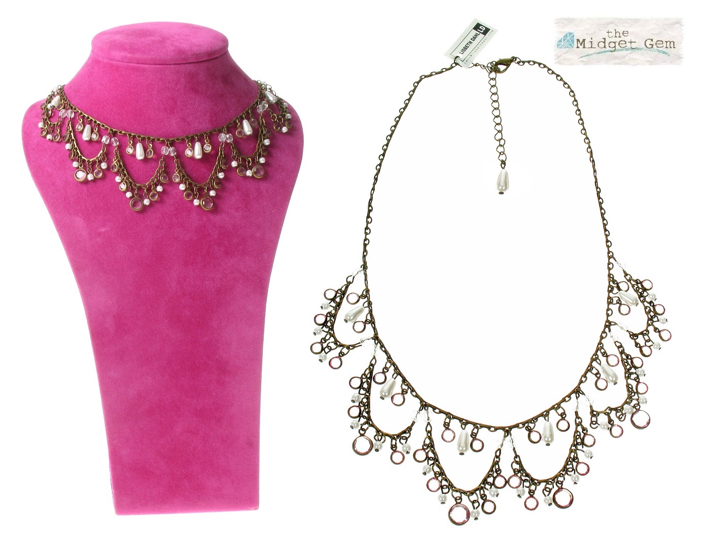 Delicate draped chains with various pearl drops and beads, and faux crystal discs. Length of front drop 3cm/30mm. The chain is a flat ‘D’ link chain 2.4mm. Adjustable length 16 inches/40 cm to 19 inches/48cm. Various beads measure 3mm – 8mm. Vintaged gold plate/shades of pink and white.