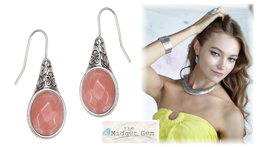 Very pretty floral impressed drop style dangly earrings with a semi-precious faceted stone insert (coral). The drops measure 3.5cm/35mm in total length. Hook style for pierced ears. Silver plate/coral.