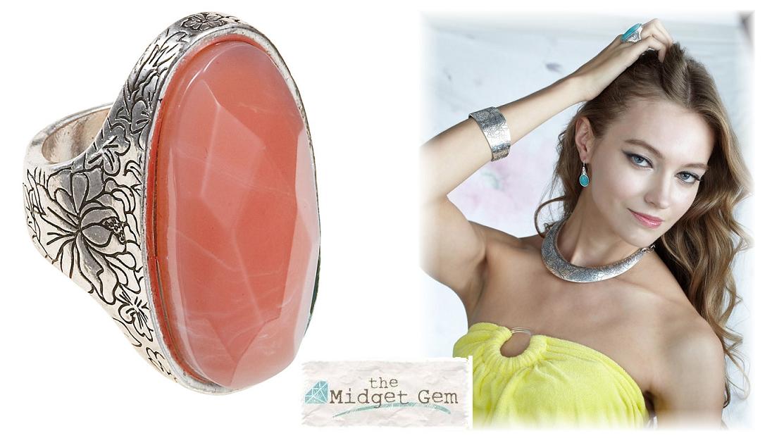Very pretty floral impressed statement ring with a semi-precious faceted stone insert (coral). The stone measures 3.5cm/35mm x 2cm/20mm. The ring comes in 3 sizes. Silver plate/coral.