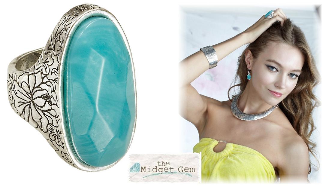 Very pretty floral impressed statement ring with a semi-precious faceted stone insert (turquoise). The stone measures 3.5cm/35mm x 2cm/20mm. The ring comes in 3 sizes. Silver plate/turquoise.