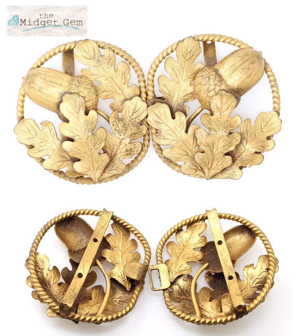 Ask for more photos, as this item is a beautiful piece that would look great on a favourite dress or over a blouse. Gilt metal, some rubbing but otherwise in lovely condition. 8.5cm x 4.5cm. A hand built item with a twisted frame and pressed metal oak leaves and acorns. It is used but utterly charming. Antique. c.1910.