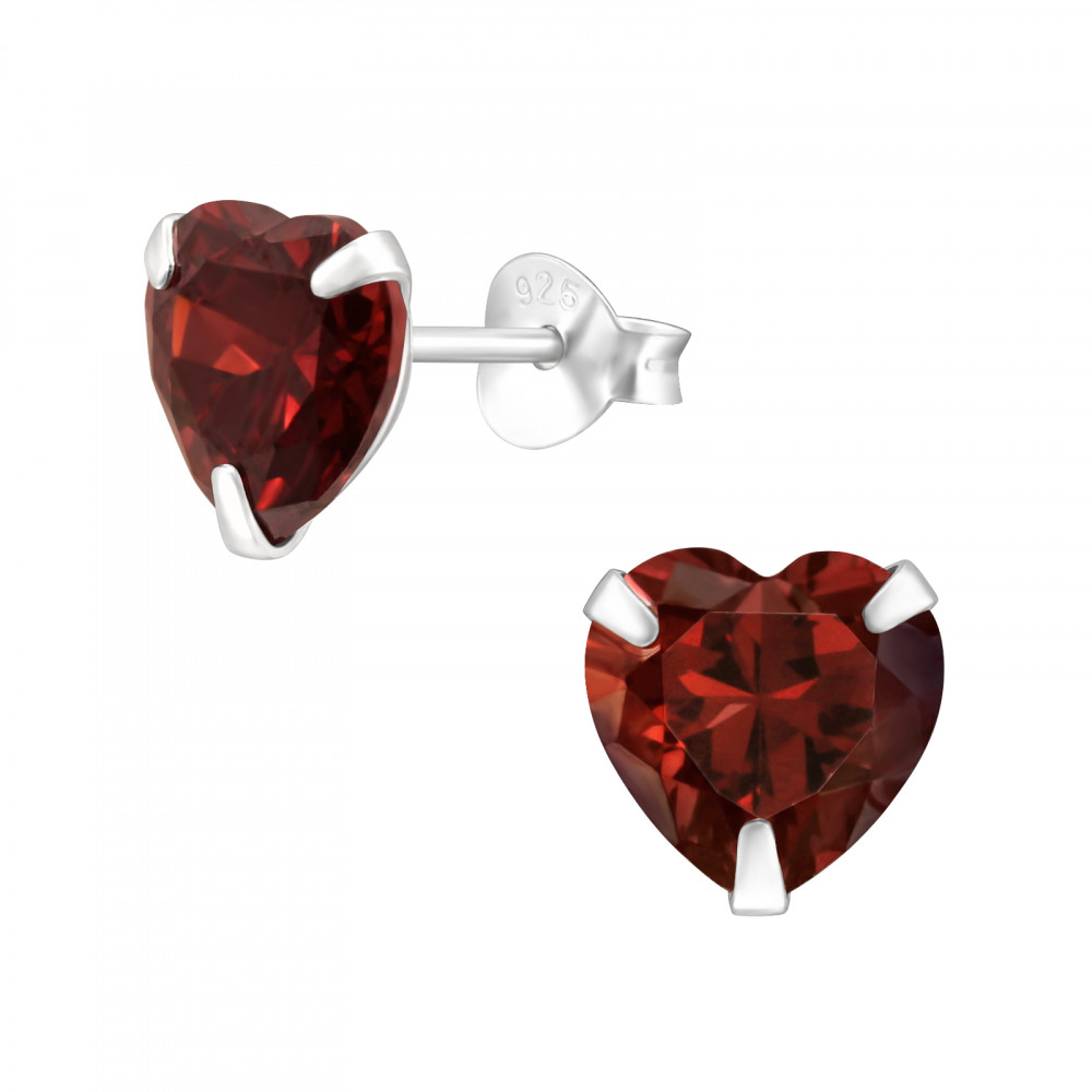 Red Crystal Love Heart - 925 Sterling Silver Classic Ear Studs. Red facet cut cubic zirconia. 8 mm x 8.5 mm.