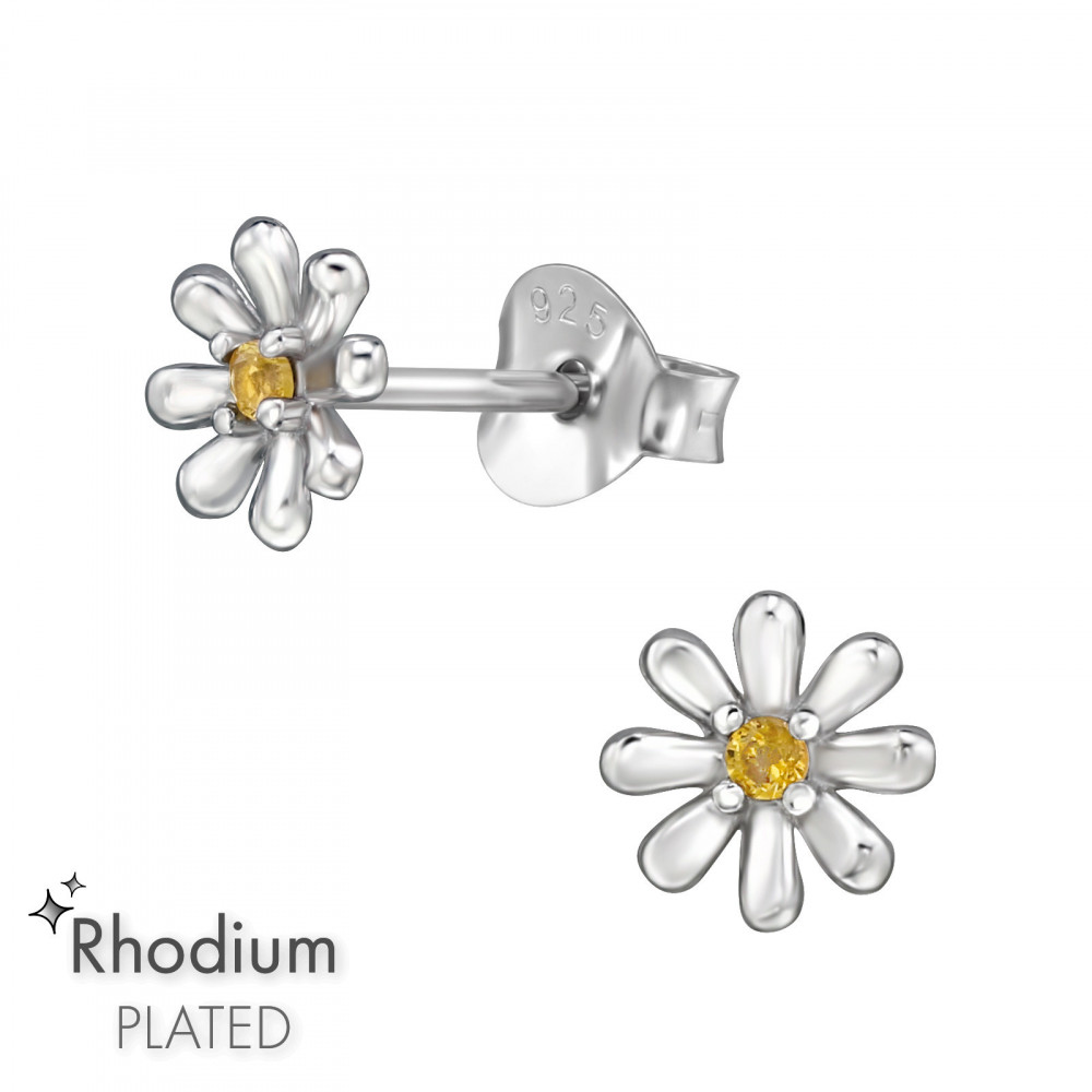 Daisy Flower - 925 Sterling Silver & Yellow Cubic Zirconia Ear Studs. Rhodium plate prevents tarnish. 5 mm x 5 mm.
