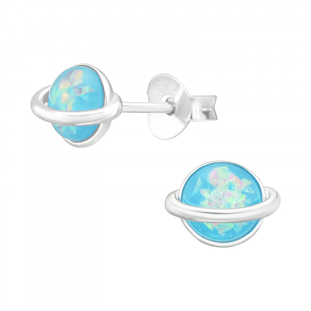 Planet Saturn - 925 Sterling Silver Semi Precious and Opal Ear Studs. 6.9 mm x 6.9 mm.