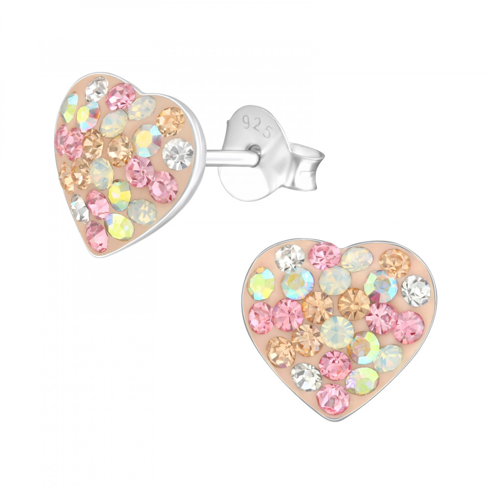 Heart - 925 Sterling Silver & Multi-Coloured Crystal Ear Studs. 9 mm x 8 mm.