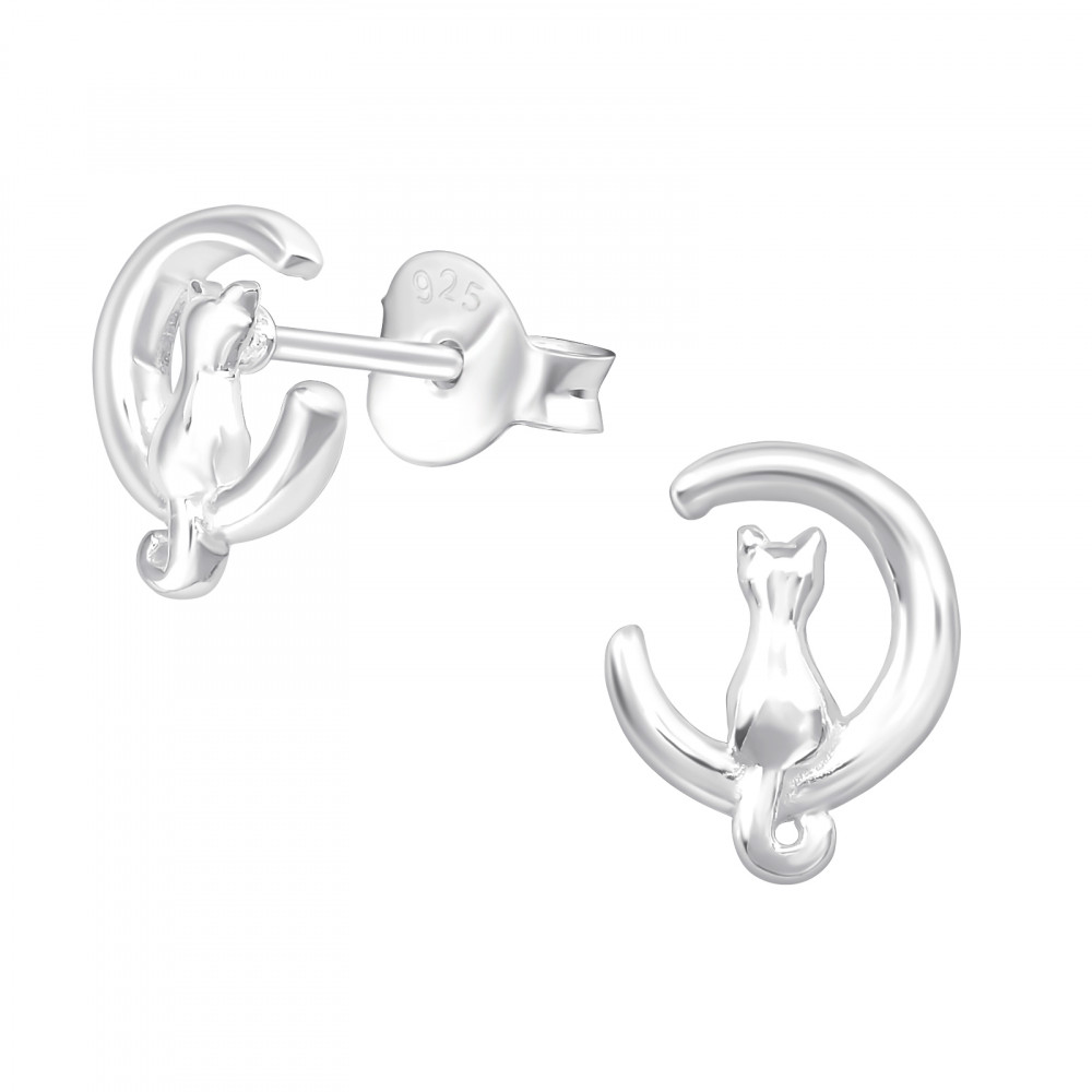 Cat on Moon - 925 Sterling Silver Plain Ear Studs. 6 mm x 8 mm.