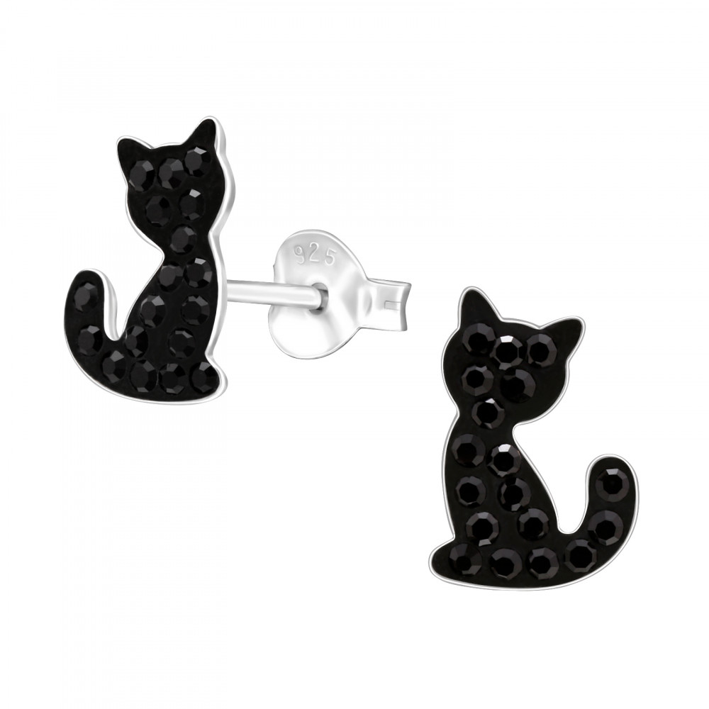 Cat - 925 Sterling Silver Black Crystal Ear Studs. 6.8 mm x 10 mm.